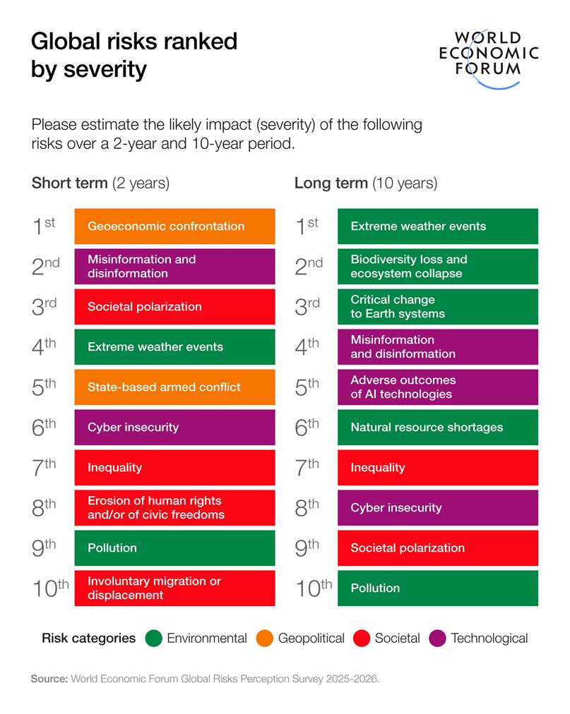 The report analyses risks across three timeframes: immediate (2026); short-to-medium term (the next two years); and long term (the next 10 years). In the near term, armed conflict, the weaponization of economic tools and societal fragmentation are colliding. As these immediate risks intensify, longer-term challenges from technological acceleration to environmental decline are also creating knock-on effects.