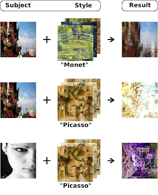 - Reproduction du style : à partir du moment où IArtist à son sens critique pour le style, il va pouvoir commencer à "peindre" : en partant de l'image sujet, il va appliquer des traitements de façon aléatoire, et soumettre à chaque fois le résultat au critique. Si le critique lui dit que c'est plus proche du style qu'avant, IArtist recommence en partant du dernier résultat. Dans le cas contraire, il reviendra au résultat précédent. IArtist s'arrête quand le critique lui dit que l'image obtenue appartient au style.